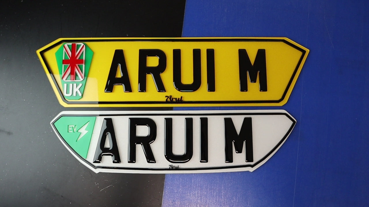 The front plate features a refined UK flag badge integrated into the layout, so it reads as part of the composition. The rear replaces national branding with an EV emblem and bolt motif to keep the backplane focused and modern. Every small badge is laser cut and finished to match the plate’s depth and gloss so the whole set feels cohesive.