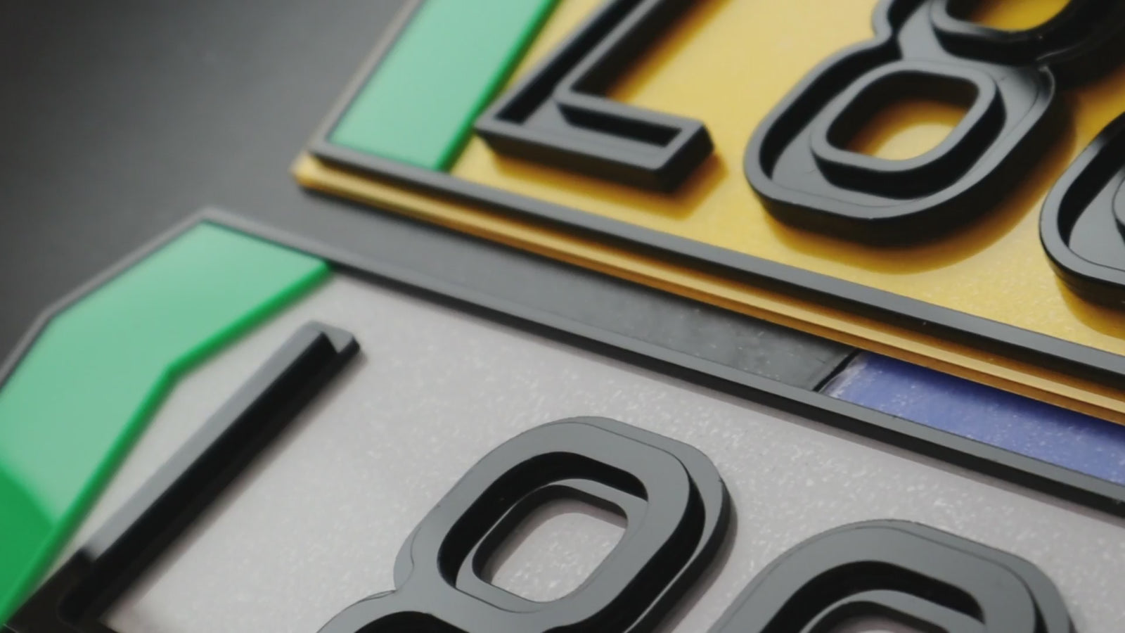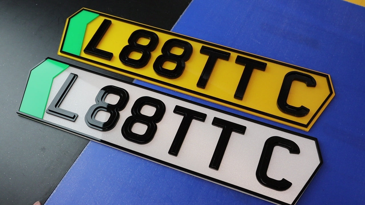 Everything you see can be changed. Want the EV flash a different colour or removed entirely? Prefer the raised profile on both plates instead of a matched pair? Need different lettering styles or spacing for a specific car make or model? Contact us for advice and a bespoke quote. We love refining details and will guide you to a solution that fits your vehicle and style.